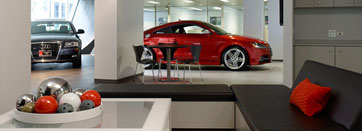 Clear connection from the service write-up zone directs the customer into the Audi space. The atmosphere and detailing foreground the cars on display to create a clear organization of the facilities' processes.